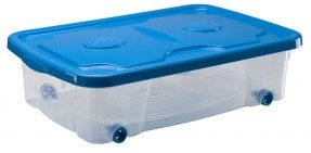 Contenitore in plastica trasparente con coperchio blu apribile dall'alto. CONTENITORE PLASTICA MULTIUSO MIS 80X60X18h BOX STORAGE CON RUOTE E COPERCHIO.